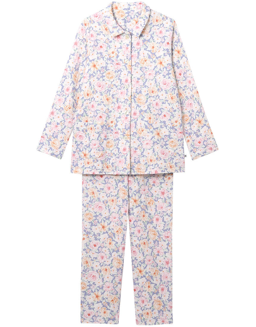 【パジャマ(ロング袖ロングパンツ)】吸湿発熱性のある糸を肌側に使用したキルトニット。保温性にすぐれた、とてもあたたかな素材。繊細な色のトーンで表現した花柄はエアリーな印象。【サイズ詳細】S:身幅48.0cm 着丈67.0cm 身丈69.5cm 肩幅39.0cm 袖丈54.5cm ボトム脇丈95.0cm 裾まわり37.0cm ウエスト53.0cm ヒップ97.0cm 股下(レングス)68.0cm M:身幅52.0cm 着丈67.0cm 身丈69.5cm 肩幅40.0cm 袖丈55.0cm ボトム脇丈95.0cm 裾まわり39.0cm ウエスト58.0cm ヒップ100.5cm 股下(レングス)67.5cm L:身幅56.0cm 着丈67.0cm 身丈70.0cm 肩幅41.5cm 袖丈55.0cm ボトム脇丈95.5cm 裾まわり41.0cm ウエスト63.0cm ヒップ104.5cm 股下(レングス)67.0cm LL:身幅60.0cm 着丈68.0cm 身丈71.0cm 肩幅43.0cm 袖丈55.5cm ボトム脇丈96.0cm 裾まわり44.0cm ウエスト68.0cm ヒップ109.5cm 股下(レングス)67.0cm※出来上がり寸法を表示しております※サイズ詳細の寸法には多少の差異がございます出来上がり寸法の測り方についてはこちら※アイテムによって柄の出方が異なりますのでご了承ください。