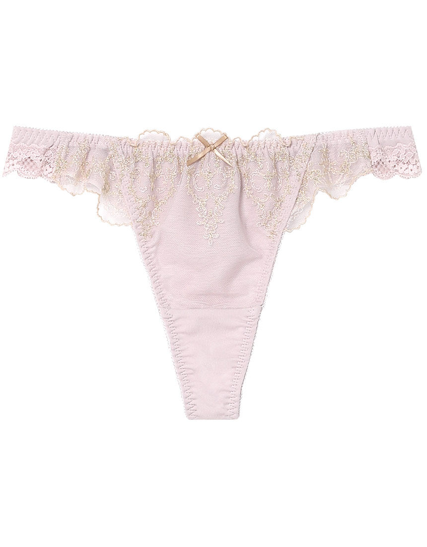 キラキラと輝きを放つ繊細なラメ糸を用いたエンブロイダリーレースをあしらったグループ。・ピンクゴールドの刺繍の輝きが大人の印象のくすみブルー【BUカラー】・シルバーの刺繍との組み合わせが普遍的に愛らしいアイボリー【IVカラー】・やさしいゴールド×ベージュの刺繍がフェミニンなくすみピンク【PIカラー】のカラー展開。●フロントにエンブロイダリーレースをあしらったソング。●刺繍のラメ糸の色味に寄せたテープとリボンがアクセントになっています。●後ろ裾はストレッチレースをほどこし、くいこみにくく、アウターにひびきにくいです。