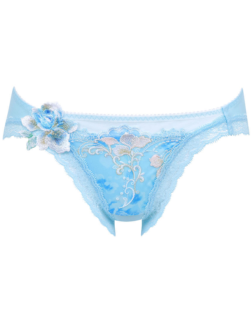 世界的な名画を表現したシリーズのショーツ。フロントはレースやパワーネットにトリコットを裏打ちして透けないつくり。サイドにレースを1枚使いで、肌をほんのり透かします。バックはストレッチ性のある生地でヒップにフィットします。ローライズ。[若冲ブルー(BS)]伊藤若冲(じゃくちゅう)は18世紀の江戸中期に活躍した日本の画家。2000年代に空前の若冲ブームが巻き起こり、超絶技巧を駆使した細密描写の鳥獣図などが、現在も幅広い世代に愛されています。ブラは鮮やかなブルーを背景に、左カップに白い象、右カップに想像上の鳥である鳳凰を主役として、動植物をにぎやかに配置しています。