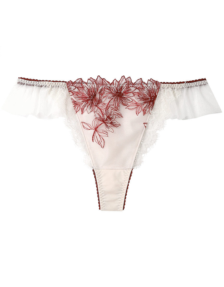 たくさんの花が重なり合った、華やかで上品なデザインのグループ。繊細なラメ糸とステッチングを組み合わせることで、軽さがありながら存在感のあるやわらかい花柄のエンブロイダリーレースに仕上げました。・心やすらぐ、やわらかで透明感のあるやさしいグレー【GYカラー】・エレガントで華やかな印象のグレーブラック【OBカラー】・ヌーディで肌なじみのよい色気漂うブラウン【OCカラー】・ロマンティックな遊びごころのあるカラーが目を引くライトグリーン【OVカラー】・4種類のグラデーションカラーを掛け合わせた花のステッチが美しい華やかなレッド【REカラー】・大人可愛いカラーでレースの美しさが目を引くピンク【WIカラー(WEB限定)】のカラー展開。●フロントにエンブロイダリーレースをほどこしたソング。●バックはストレッチレースをほどこし、くいこみにくく、アウターにひびきにくいです。●後中心にあしらったリボンがポイントです。 WEB限定カラーをご用意! WIカラーはWEB限定カラーになります。