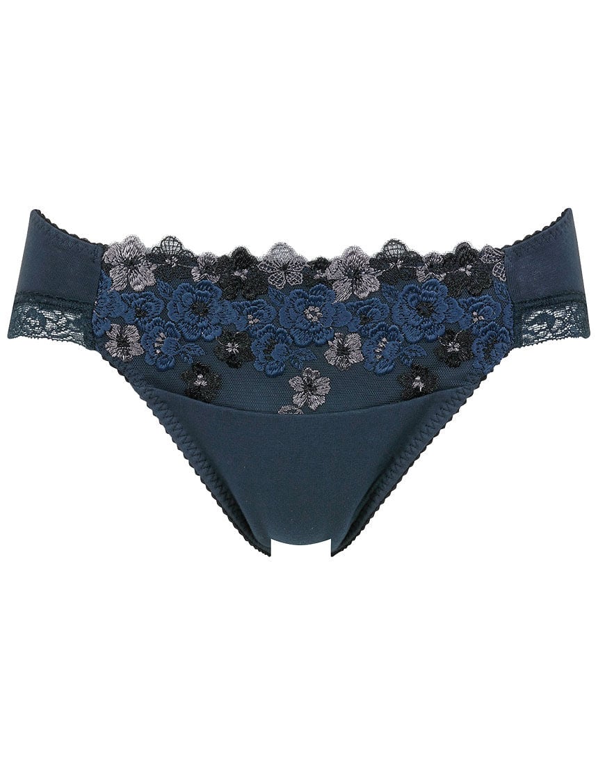 【フロント】・伸縮性のないアイラッシュレースに、配色の薄手生地を裏打ちして透けにくい。・レース下にV字型にテープをあしらって、モダンな表情。【バック】・フィット感の良いストレッチレース。脚ぐりにゴムを使わず、軽いはき心地で服にひびきにくい。【はき込み】・レギュラー(ふつう)