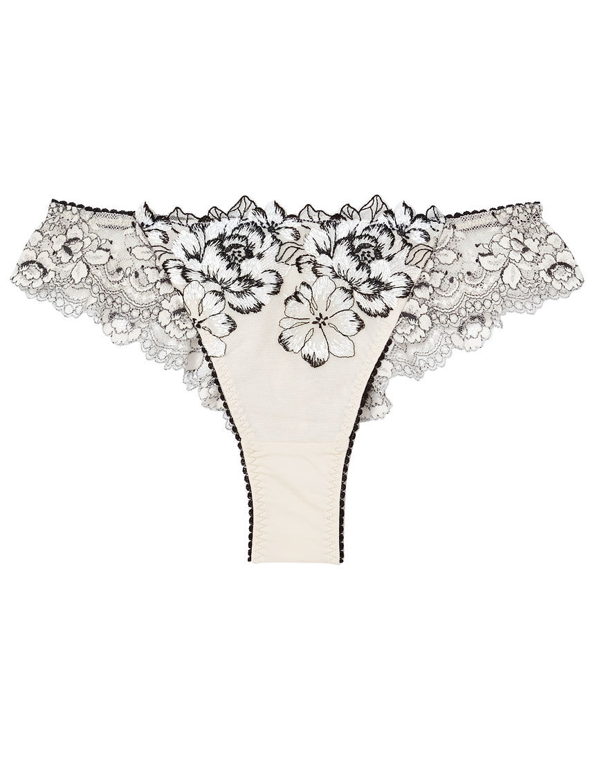 多色の刺繍糸でカラフルな花束をデザインしたグループ。繊細で高級感のあるエンブロイダリーレースを使用しています。華やかさのあるカラフルなカラーは、色によって印象がガラッと変わるので、その日の気分によって選んで頂くのもおススメです。フロントにエンブロイダリーレースをほどこしたソング。バックはやや広めのストレッチレースをほどこし、くいこみにくく、アウターにひびきにくいです。