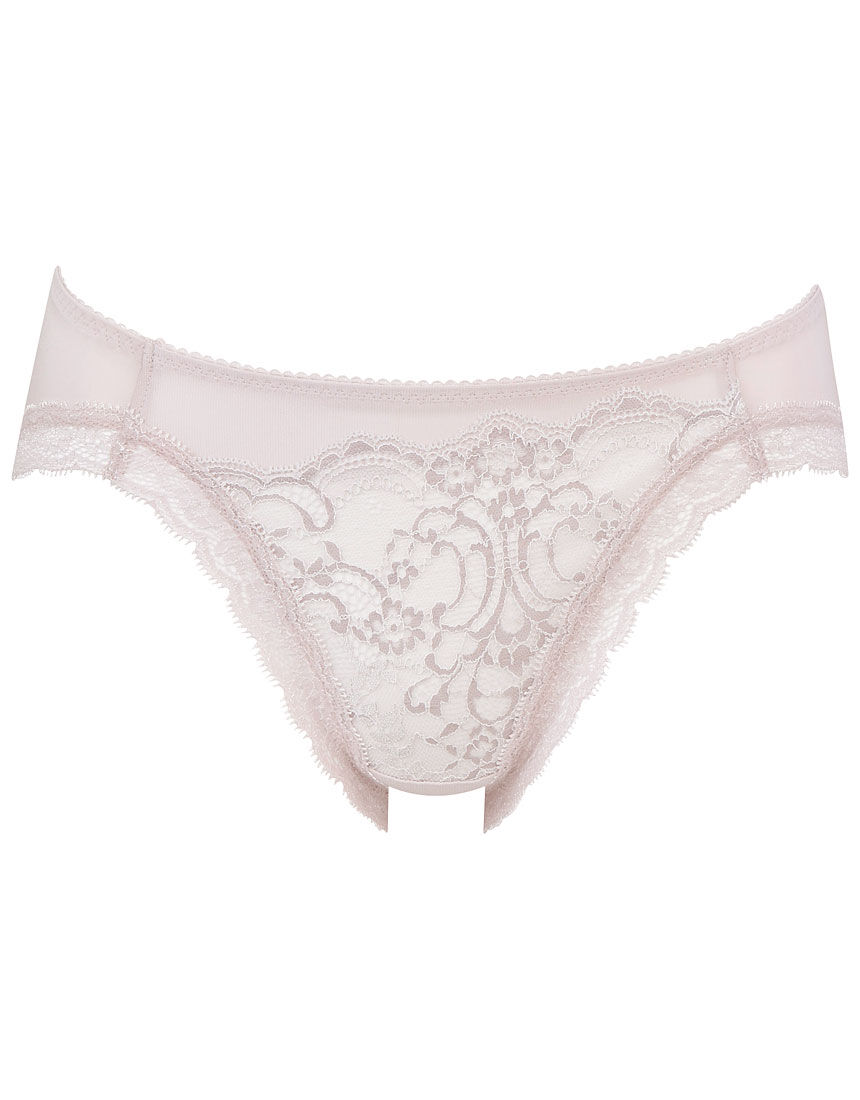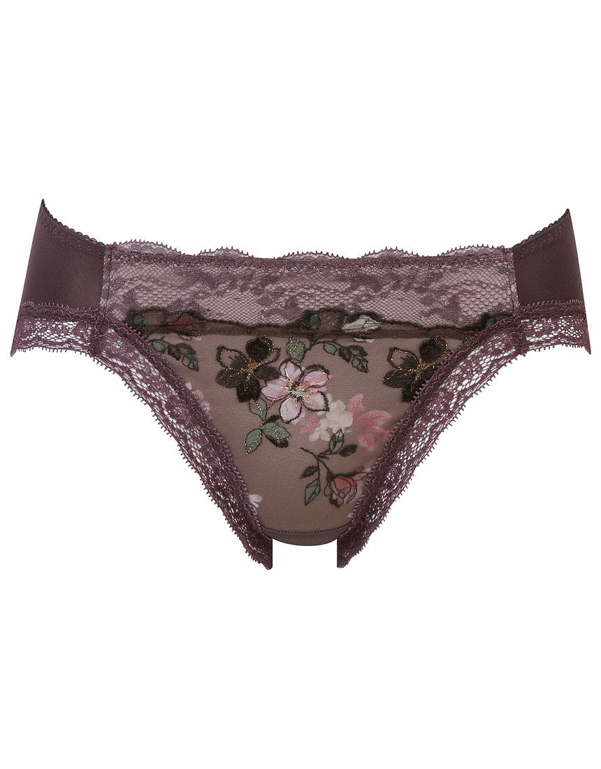 ・後ろ裾はフリーカッティング素材で肌にくいこみにくく、アウターにひびきにくい・前ウエストは折り返し始末でおなかにくいこみにくく、圧迫感を軽減・ラメ糸の光沢が美しいレースと総プリントの、グレード感のあるデザイン・はきこみ丈:あさめショーツの種類(ウエスト位置、裾ライン位置)についてはこちら をご覧ください。