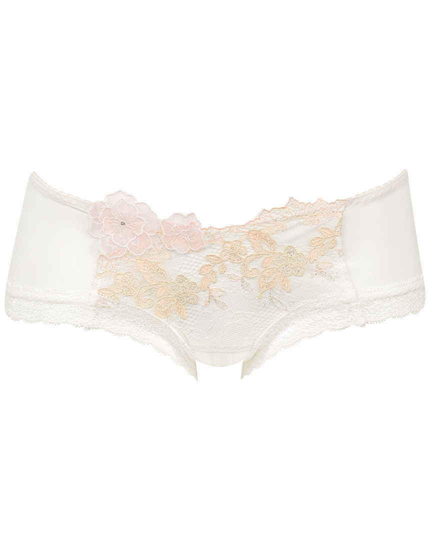 狩猟と月を司る女神を、アイコニックに表現。動物たちを愛し、金の弓を巧みに操ったという伝説にちなんで弓や羽をラメ糸のきらめく刺繍で表現したデザインは、クラシカルなのにフレッシュ。カメリアのアップリケや、エンブロイダリーレースの美しさも見逃せない。「パルファージュ」2023年春夏シーズンのテーマは「神話」。ロマンティックな神話の世界に登場する女神たちを各シリーズのミューズに見立て、そこから広がる物語をパルファージュ流に表現しました。2023年春夏コレクションのグループはパルファージュブランドサイトでもご覧になれます。・フロントは裏打ち付きで透けにくい・ラメ糸のきらめく刺繍に立体アップリケを重ねた特別感あるデザイン・右脇のアップリケにはクリスタル付き・はきこみ丈:あさめ・ボーイレングスショーツショーツの種類(ウエスト位置、裾ライン位置)についてはこちら をご覧ください。