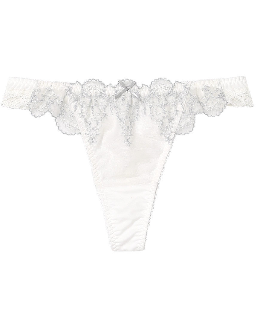 草木の葉脈や水面のような自然のゆらぎをテーマに繊細なタッチで描いたレースのグループ。ラメ糸のきらめきでさらにその美しさを引き立てます。透明感にこだわったカラーリングもポイントです。フロントに繊細なエンブロイダリーレースをほどこし、バックまで抜け感のあるレースをあしらった、贅沢な印象のデザインショーツ。前中心にあしらったラインストーンのチャームがポイントです。