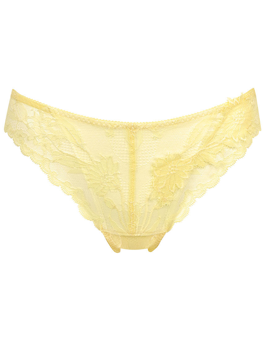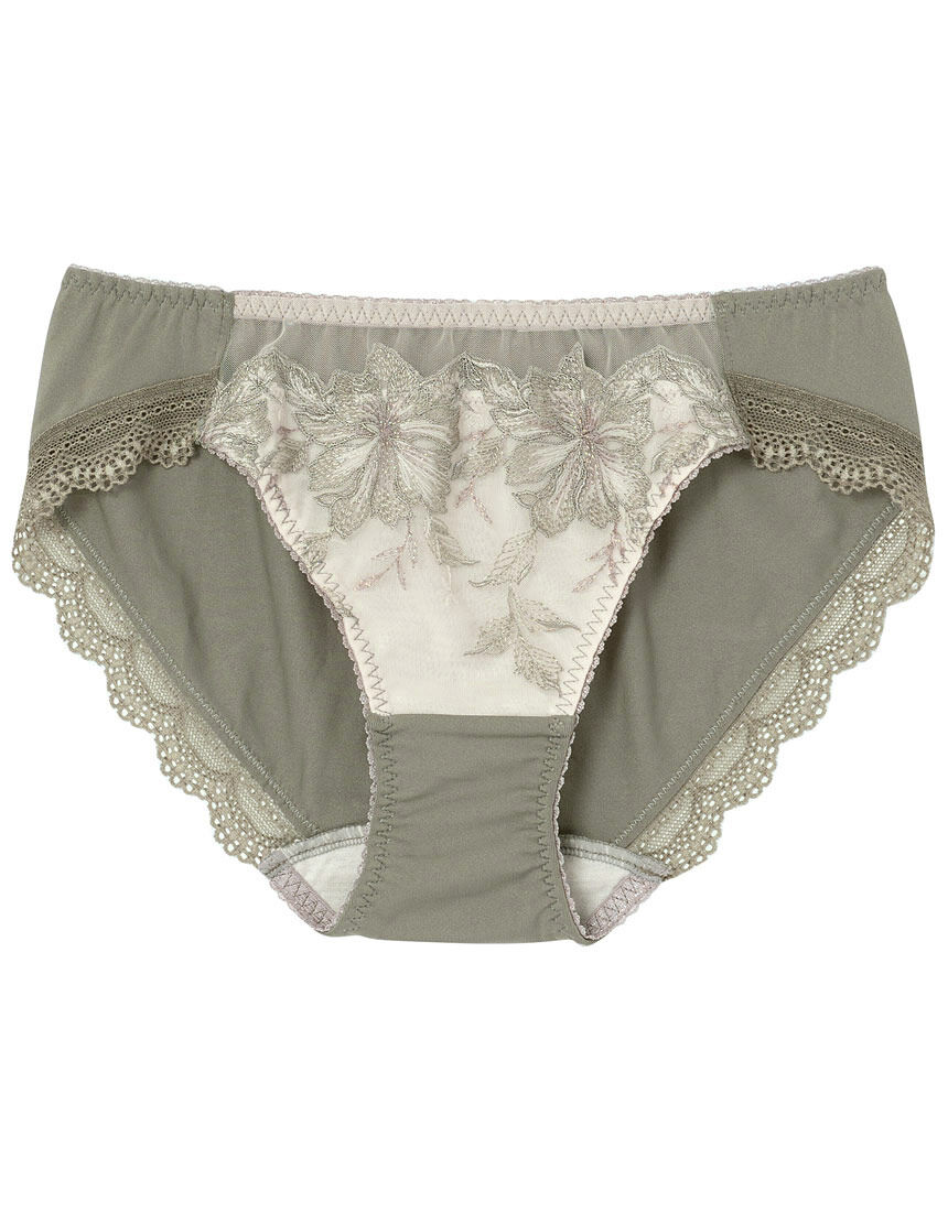 エレガントな印象の大花柄のエンブロイダリーレースを使用したグループ。ラメ糸のエッセンスと大花柄をふちどったスカラップレースのメリハリで、いつもより華やかな日常を演出します。フロントにエンブロイダリーレースをほどこしたショーツ。バックは、はきごこちのよい縦横に伸びる素材を使用しています。裾にはストレッチレースをほどこし、アウターにひびきにくいです。