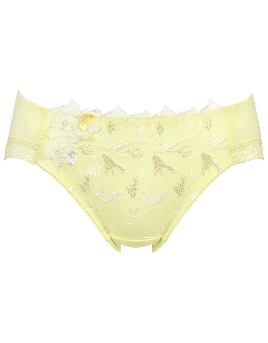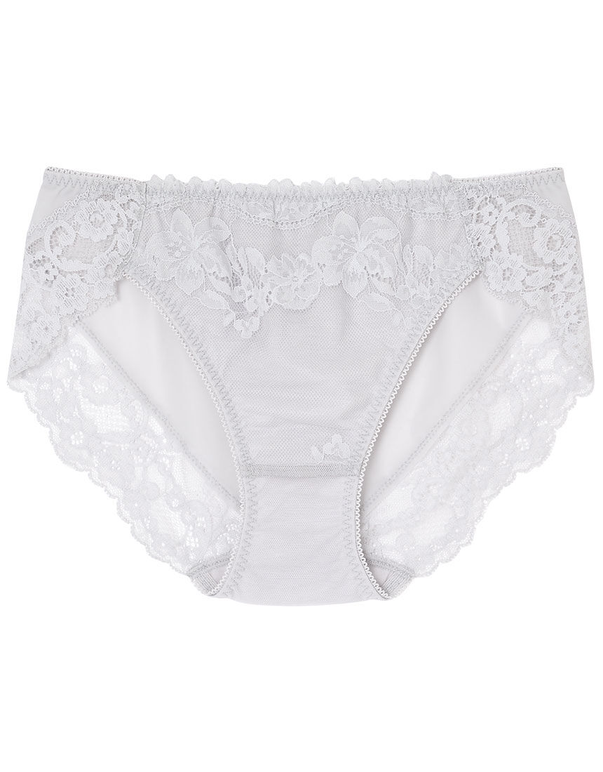 流れるようなラインに花々が並ぶ、すっきりとした印象のレースが、抜け感と軽さを演出しているグループ。シンプルなネットの上に押し花を配置したようなデザインのストレッチレースは、簡潔な美しさをたたえています。フロントにストレッチレースをストレートにほどこしたショーツ。バックは吸汗速乾で伸びのよい素材を使用しています。裾にはストレッチレースをほどこし、アウターにひびきにくいです。