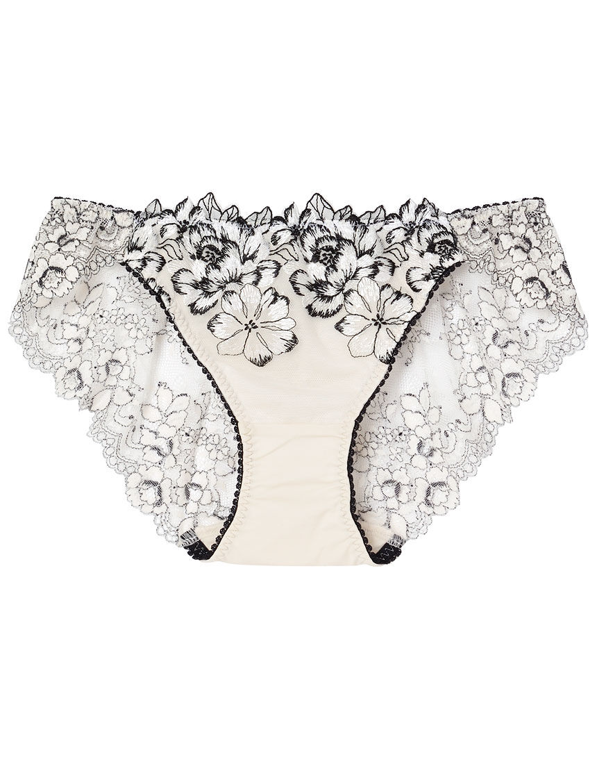 多色の刺繍糸でカラフルな花束をデザインしたグループ。繊細で高級感のあるエンブロイダリーレースを使用しています。華やかさのあるカラフルなカラーは、色によって印象がガラッと変わるので、その日の気分によって選んで頂くのもおススメです。抜け感のあるストレッチレースをバック全体にほどこした、贅沢な印象のデザインショーツ。フロントにエンブロイダリーレースをほどこし、繊細な表情に仕上げました。